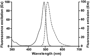Calcein AM分子式为C46H46N2O23,分子量为994.86,CAS号为148504-34-1。水解产物Calcein的最大激发光波长为494nm,最大发射光波长为514nm。Calcein的激发光谱和发射光谱参考图2。